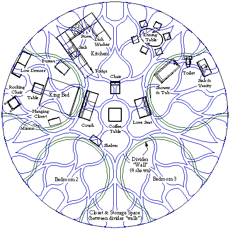 This is a possible floor plan for a 2,000 square foot (50 foot diameter) Lotus Dome. The plan shows the structural ribs in blue, the divider "walls" between rooms in green and various home furnishings in black. The four divider "walls" shown enclose 200 square feet each. Thus there could be two 200 square foot bedrooms, one 100 square foot bathroom (shown within one-half of one of the divider "walls") and a master bedroom of almost 400 square feet (including a section of the closet and storage space).